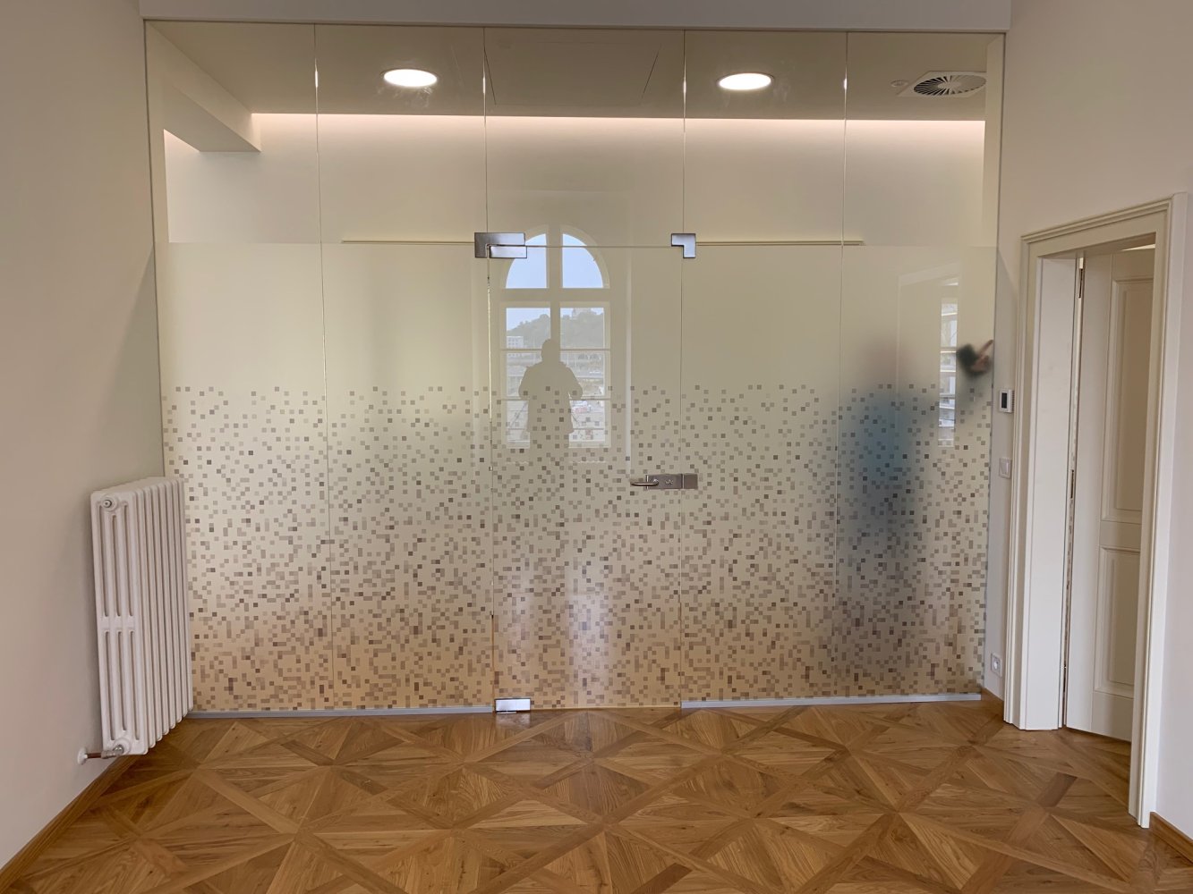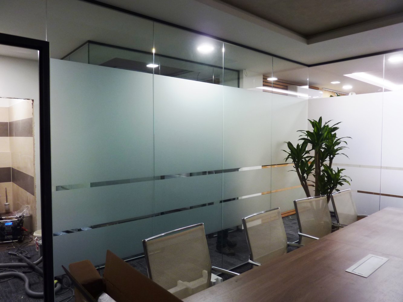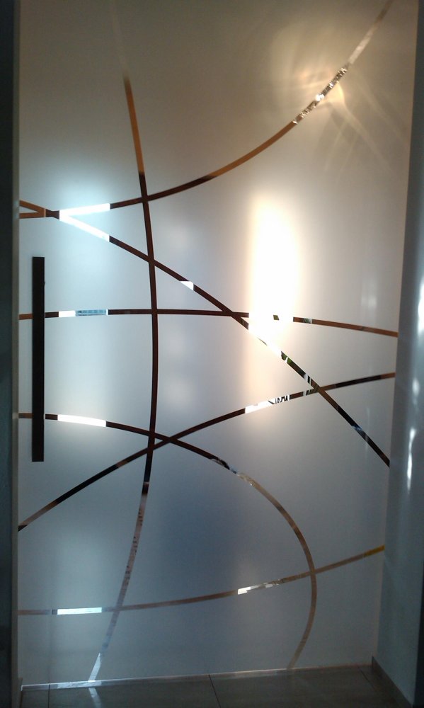 Pro částečné zajištění soukromí a vytvoření zajímavého optického oddělení prosklených stěn , instalujeme gradientní degresivní mléčné fólie s efektem postupně ubývající matné části až do zcela čiré části fólie.